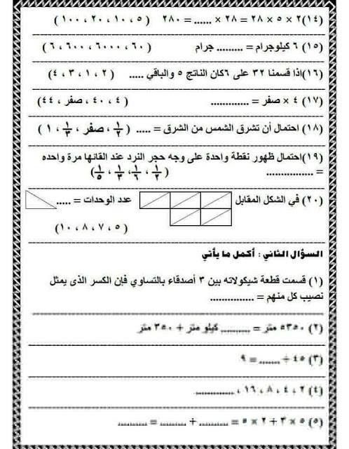 نماذج اسئلة رياضيات للصف الثالث الابتدائي الفصل الثاني