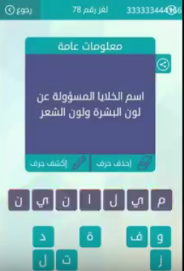 جواب سؤال اسم الخلايا المسؤولة عن لون البشرة ولون الشعر لغز رقم 78 من المجموعة التاسعة من لعبة صقور الإبدآع
