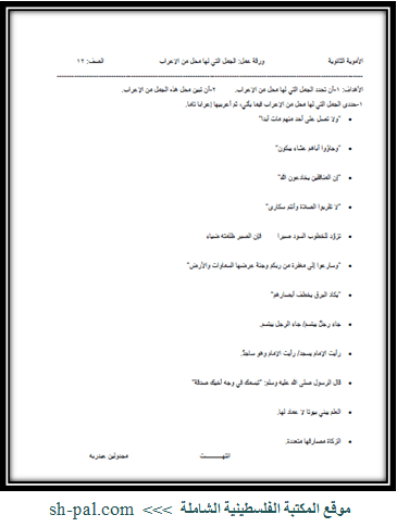 ورقة عمل في درس الجمل التي لها محل من الإعراب للصف الثاني عشر توجيهي المكتبة الفلسطينية الشاملة