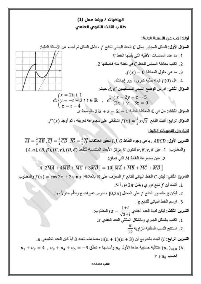 ورقة عمل 1 في مادة الرياضيات للصف الثالث العلمي 2018 2019
