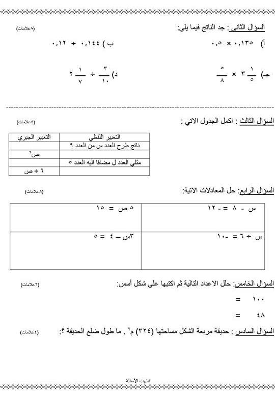 بالصور نماذج اختبار نهائي لمادة الرياضيات الصف السادس الفصل الاول منتديات صقر الجنوب