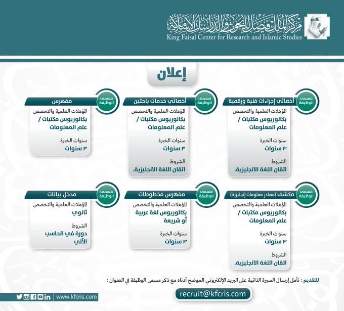 مركز الملك فيصل للبحوث والدراسات الإسلامية On Twitter يعلن مركز الملك فيصل للبحوث عن توافر وظيفة باحث في إدارة البحوث وحدة الدراسات الأمنية ولمزيد من المعلومات والتقديم على هذه الوظيفة نأمل التواصل عبر