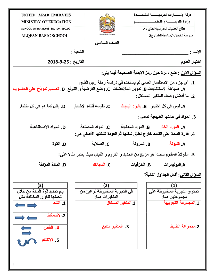 امتحان في العلوم للصف السادس الفصل الاول 2019